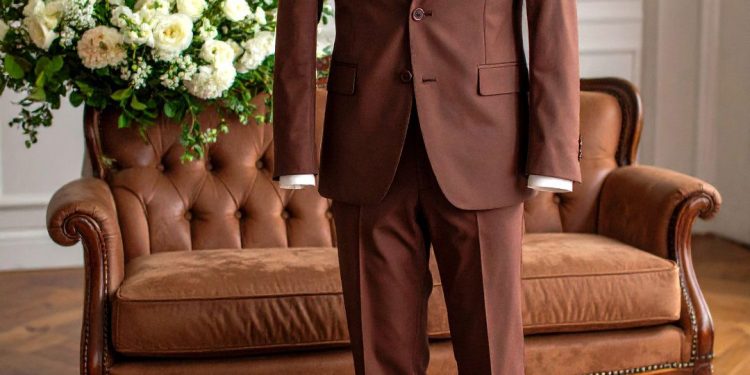 This brown suit exudes a warm, inviting elegance perfect for autumn or rustic weddings. The rich earth tone complements the leather accents and is often seen in modern ceremonial outfits. Its classic cut maintains a sharp silhouette, ideal for those seeking a blend of tradition and contemporary flair.
