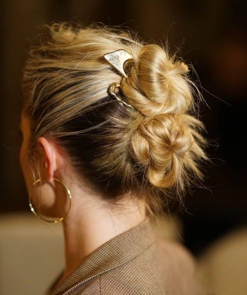 The double bun, accented with a metallic claw clip, exudes understated elegance while being practical for a busy workday. This hairstyle keeps the hair neatly off the neck, perfect for layered winter outfits or days when dirty hair needs a creative solution.