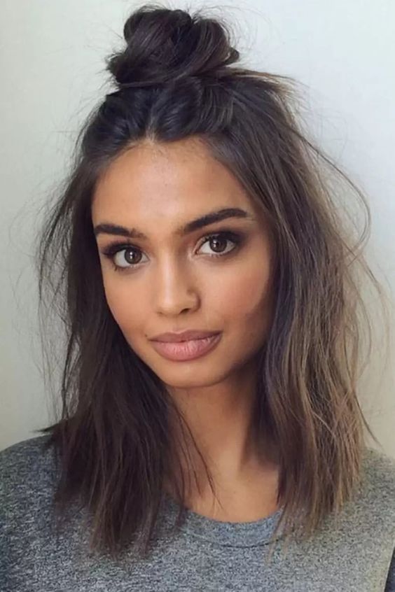 This cute and effortless half-up top knot is ideal for medium-length hair, providing a balance between casual and stylish. It’s perfect for those busy mornings when you need a quick and easy hairstyle that still looks put together.