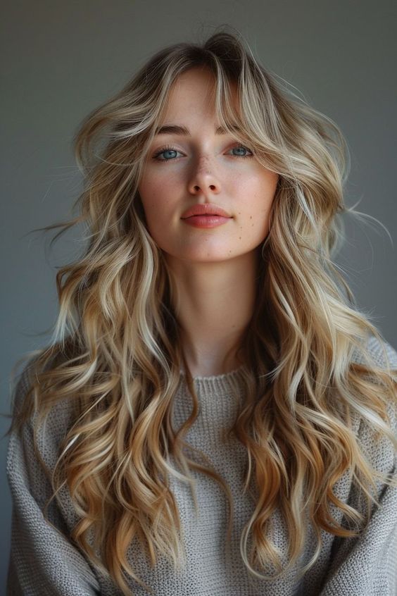 The first hairstyle features long hair with cascading waves and subtle highlights that add dimension and warmth. This look is perfect for those with medium to long hair lengths and suits a variety of face shapes.