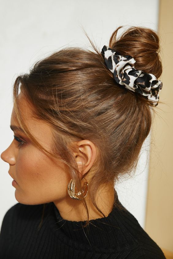 This stylish high bun is elevated with a patterned scrunchie, making it a cute and fashionable choice for those with medium hair or long hair. It’s perfect for adding a touch of fun to your everyday look.
