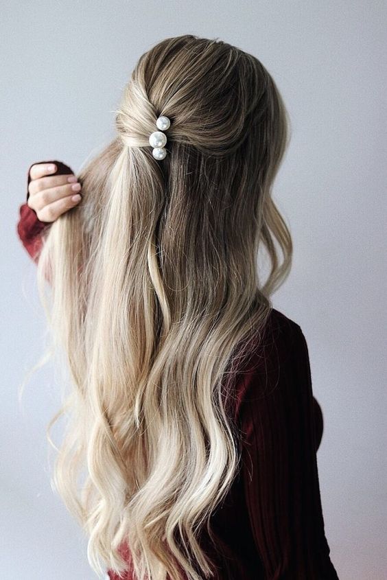 Next up is a sophisticated half-up hairstyle with a twist, adorned with pearl accents. This style is both cute and elegant, making it versatile for various occasions, from school to a casual day out.