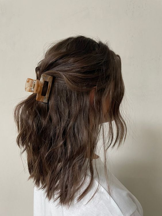 This hairstyle is perfect for medium length to long hair. The hair is loosely pulled back and secured with a tortoiseshell claw clip, creating a relaxed yet stylish look. The model is wearing a simple white top, making the hair clip the focal point of the ensemble.