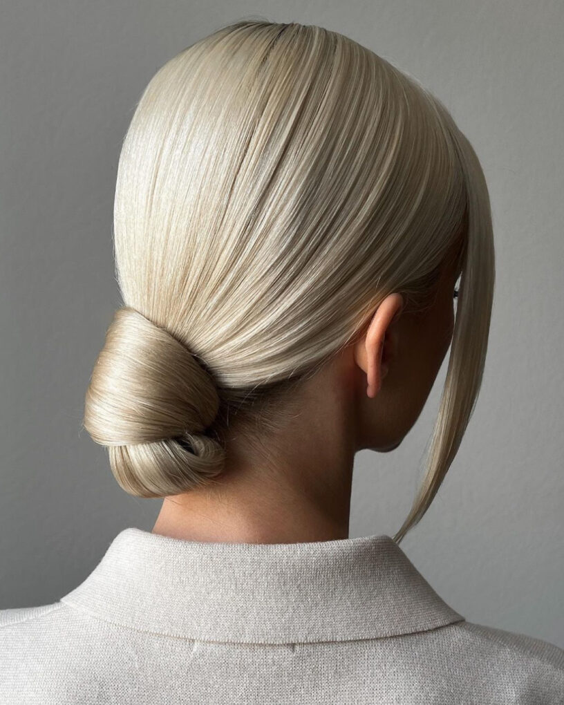 Starting with an effortlessly chic style, the sleek low bun offers a polished look that’s perfect for any school day. This hairstyle, as shown in the image, features glossy, smooth blonde hair pulled back into a low bun, ideal for maintaining a neat appearance throughout a busy day.