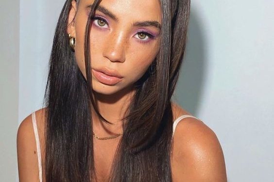 - Makeup: Subtle yet striking, with a focus on the eyes using a light purple eyeshadow.