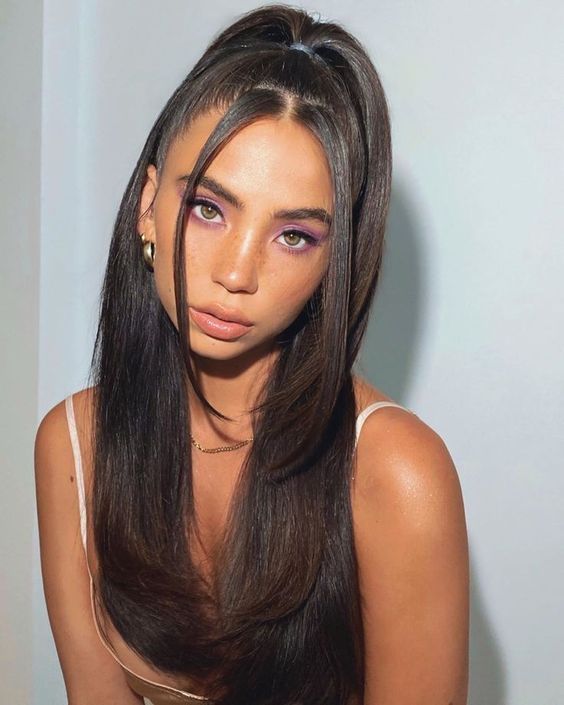 Next, we have the half-up high ponytail, a fun and youthful style that keeps things lively and playful. The dark, luscious hair is pulled into a high ponytail, leaving the rest to flow freely, framing the face beautifully.