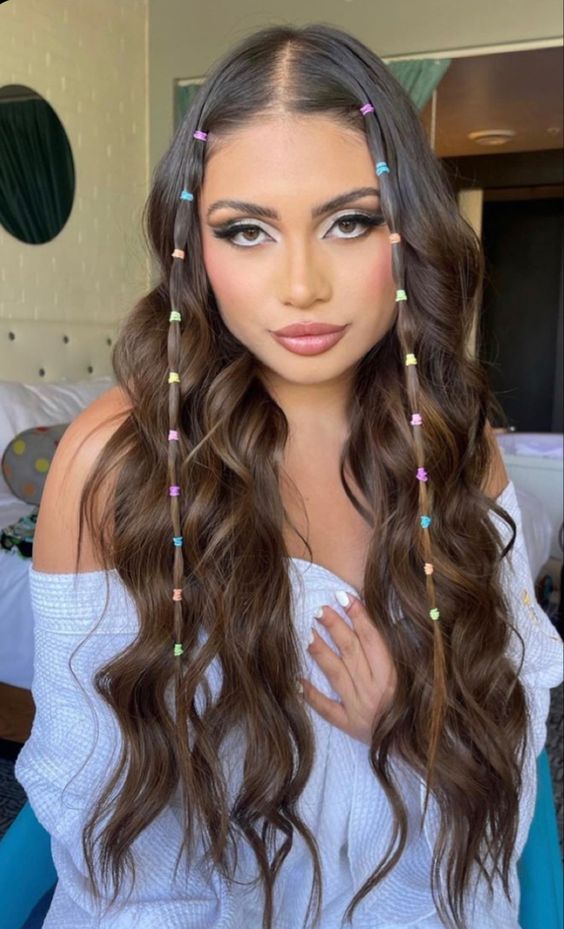 For a touch of whimsy, the beaded braids bring a creative and fun element to any hairstyle. Long, wavy hair is styled with small braids adorned with colorful beads, making it a standout look.