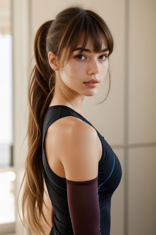 - Hairstyle: High ponytail with frontal bangs, creating a smooth, slick appearance.