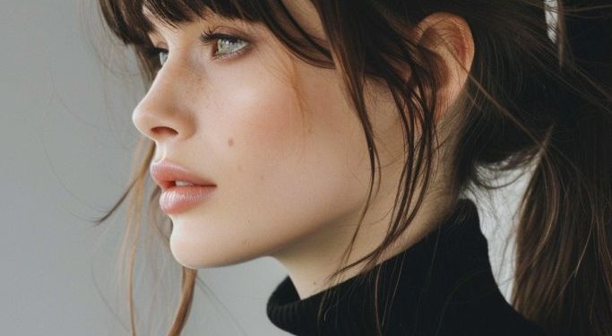 This hairstyle stands out with a bold black, slick ponytail and blunt bangs. The clean lines of the hairstyle pair perfectly with a black turtleneck, exuding a sleek and modern vibe. It’s a look that works for business settings, upscale dinners, or any occasion requiring a touch of elegance.