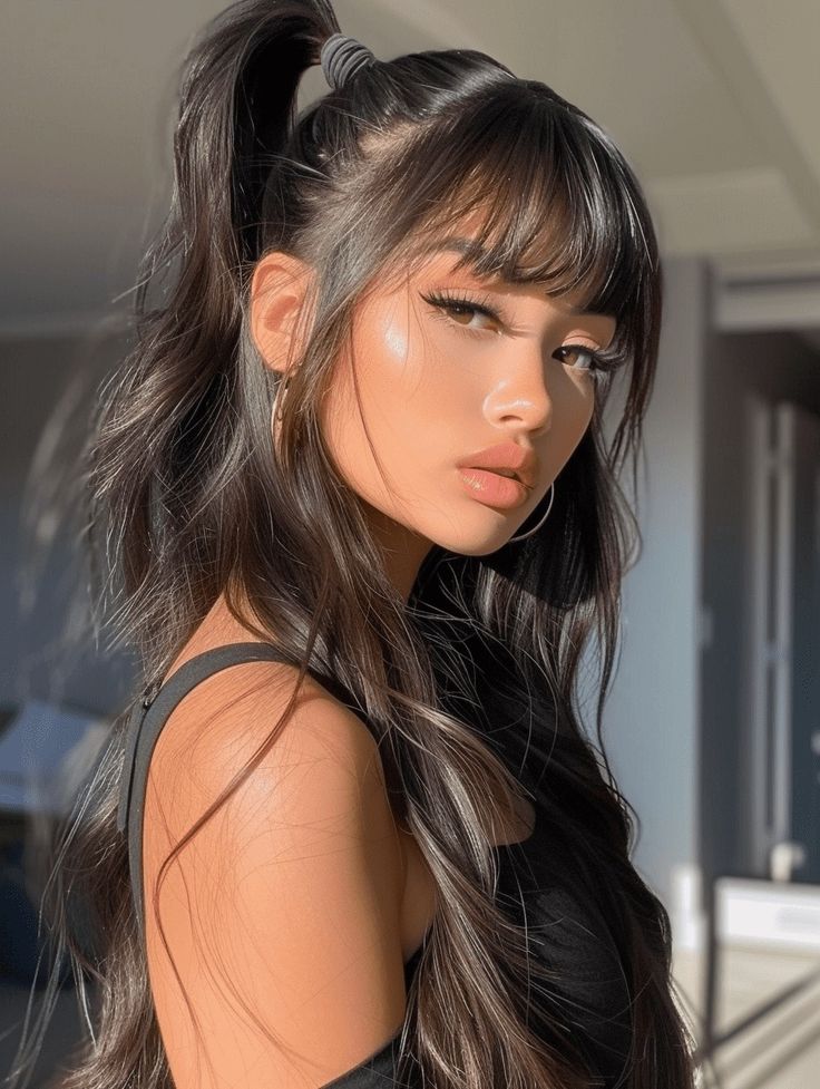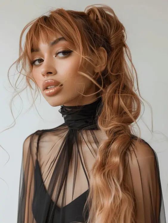 A voluminous ponytail paired with bold, full bangs creates a dramatic and messy chic aesthetic. The loose waves in the ponytail add movement and texture, contrasting beautifully with the structured bangs. This look works well for creative events or casual outings where a touch of whimsy is appreciated.