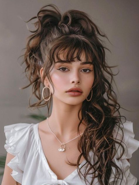 This style features a messy ponytail with wispy bangs that exude effortless charm. The hair is styled in loose, textured waves that gather into a high ponytail, giving it a carefree yet polished vibe. The white ruffled top adds a touch of romance to the look, balancing the casual hairstyle with an elegant outfit. Ideal for an oval or long face shape, this style softens angular features and brings a natural glow to the overall aesthetic.