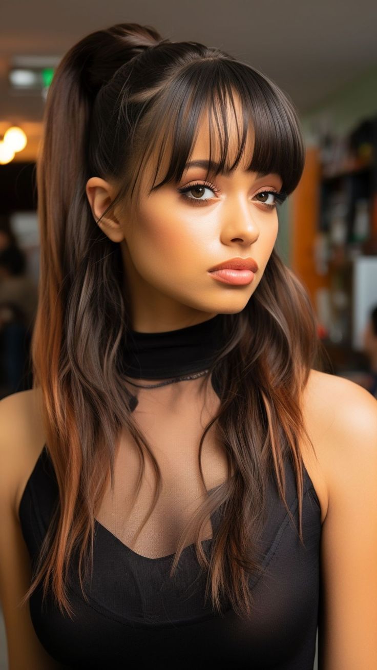 Voluminous Ponytail With Full Bangs