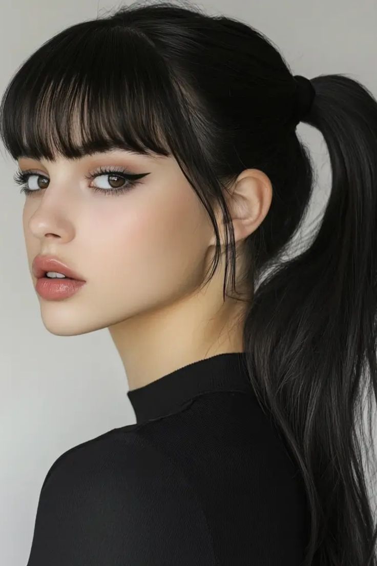 This low ponytail with sharp, jet-black bangs exudes edgy sophistication. The ponytail is sleekly styled, sitting at the nape of the neck, while the bangs feature a straight-across cut for a bold and modern look. Paired with a simple black top, this hairstyle is all about clean lines and dramatic flair. Perfect for square or oval face shapes, the straight bangs provide structure and symmetry.