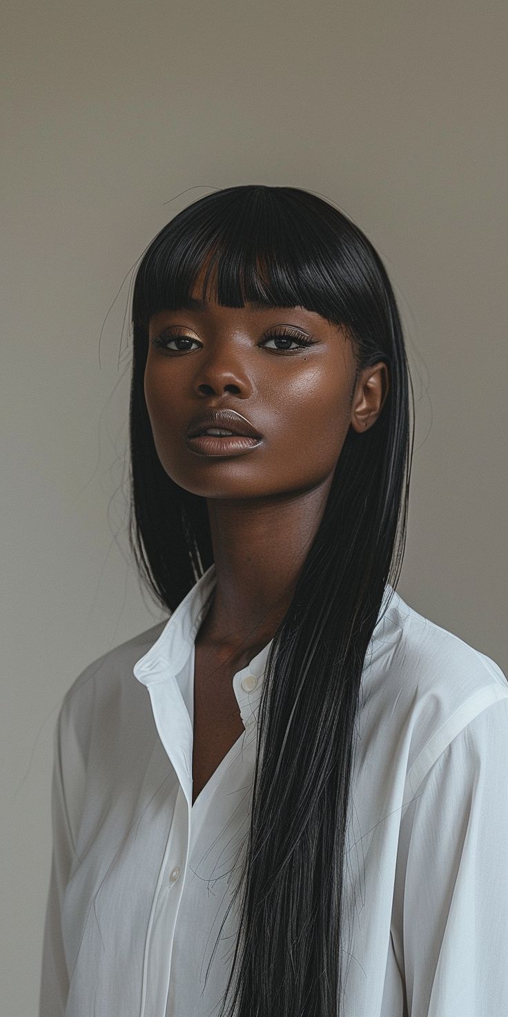- Full bangs: Straight-cut and heavy, creating a bold statement.