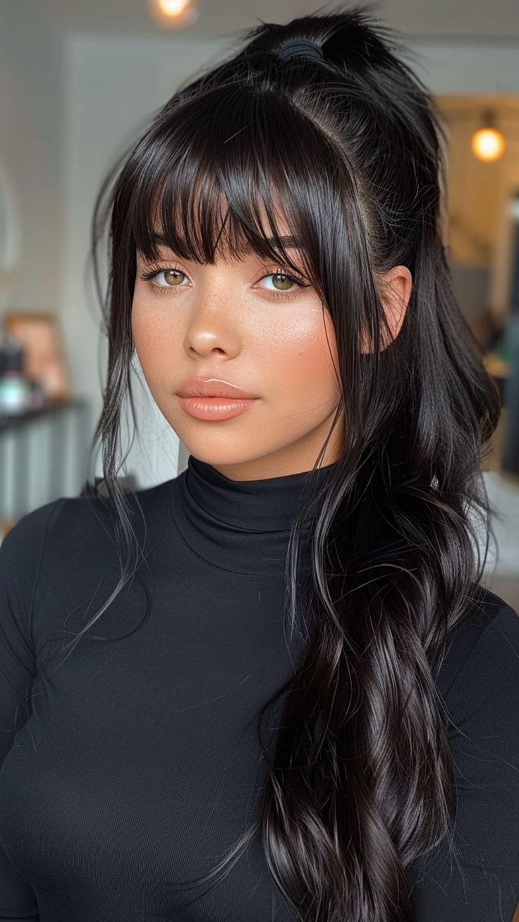 This long and voluminous ponytail is paired with soft, natural bangs that frame the face beautifully. The overall style radiates a casual yet chic vibe. The model’s black high-neck top adds a contemporary edge, making this look versatile for both day and evening occasions.