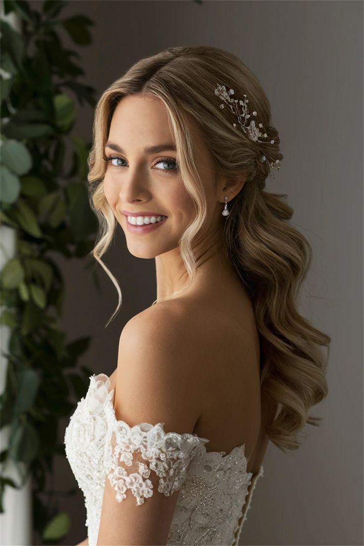 This elegant hairstyle is perfect for brides who want a timeless and romantic look. The long hair is softly curled into loose waves and partially pulled back into a half up style, secured with delicate floral pins. The intricate lace of the off-the-shoulder wedding gown adds to the ethereal quality of this look, making it ideal for classic weddings.