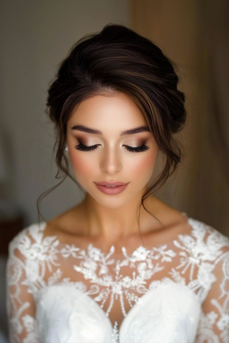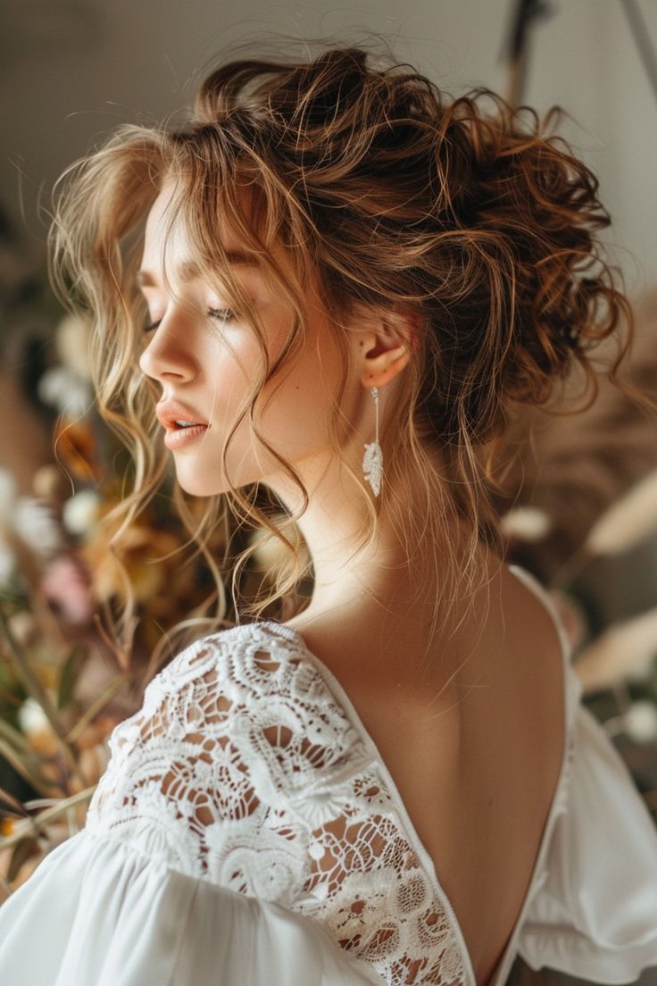 For brides who adore boho-inspired styles, this textured updo is a dream come true. The loosely pinned curls create a sense of movement, while the soft tendrils around the face add a romantic, undone vibe. Paired with a flowy, lace gown, this hairstyle is perfect for outdoor weddings or rustic venues.
