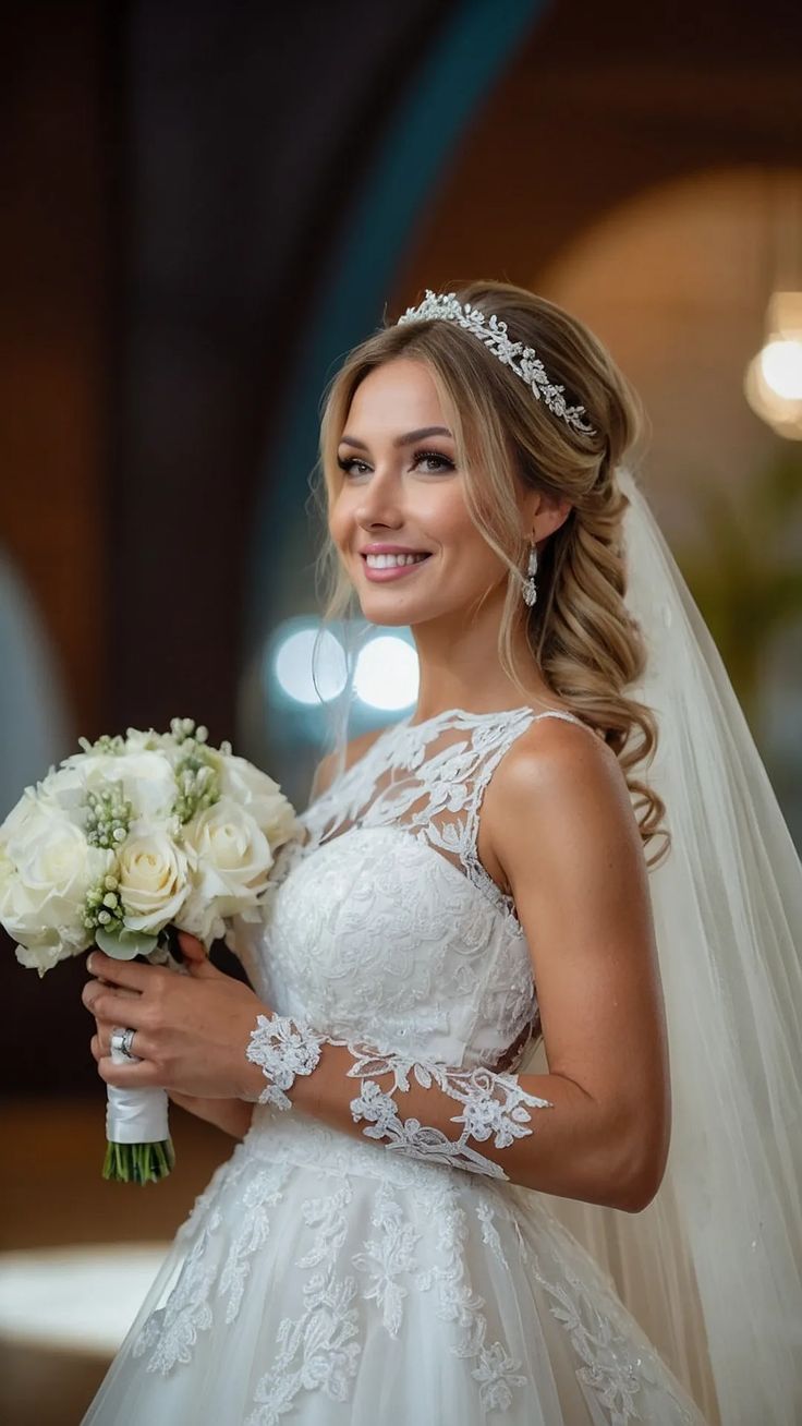 - Accessories: A sparkling tiara paired with a long, flowing veil for a royal-inspired touch.