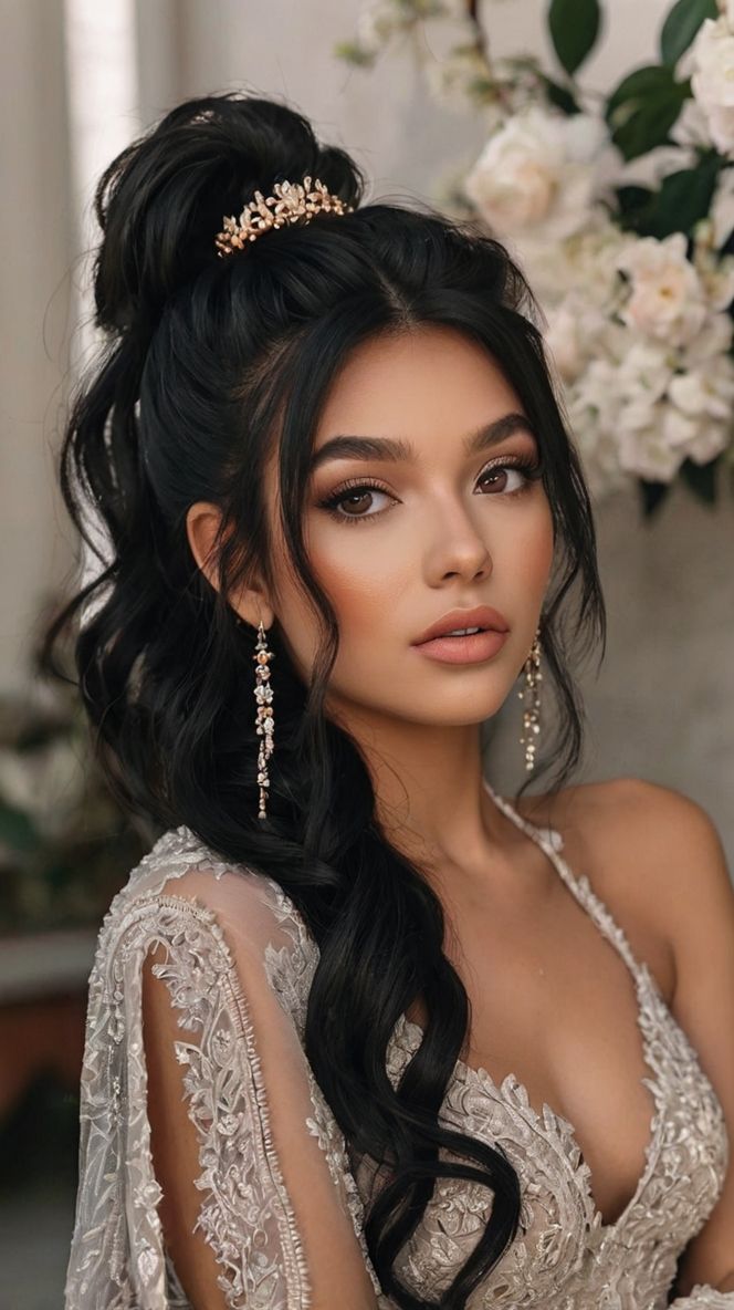 For brides who love a bold yet refined style, this half up the bride updo is a statement-maker. The voluminous curls cascade down the back, while the top section is gathered into a high ponytail adorned with a gold hairpiece. The intricate detailing of the gown enhances the dramatic flair of this look.