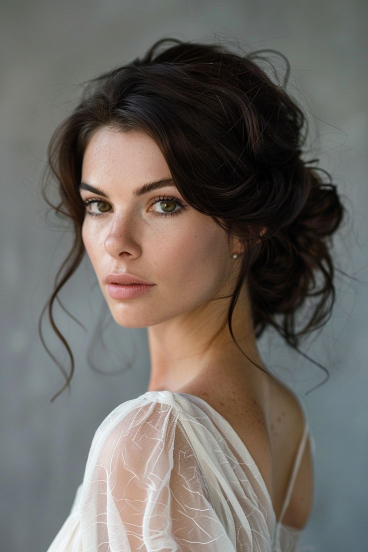 - Hairstyle: A textured updo with loose, face-framing strands that exude casual elegance.