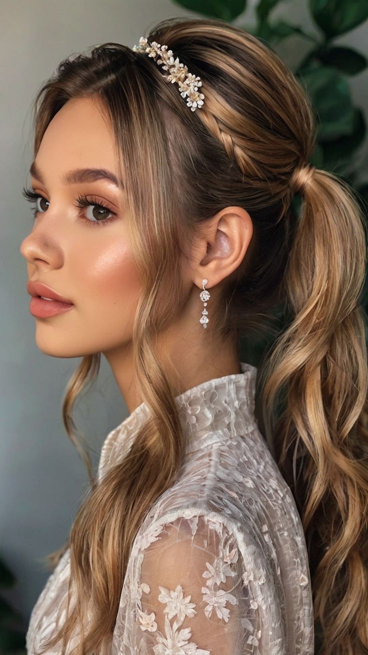 Adding jeweled hairpins at the base of the ponytail would enhance the look. Avoid overly heavy braids that might weigh down the ponytail.