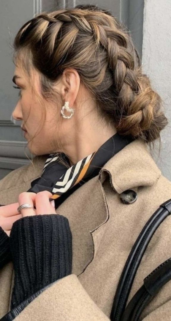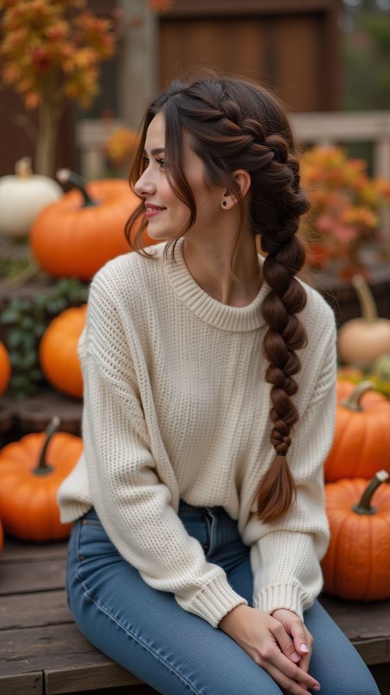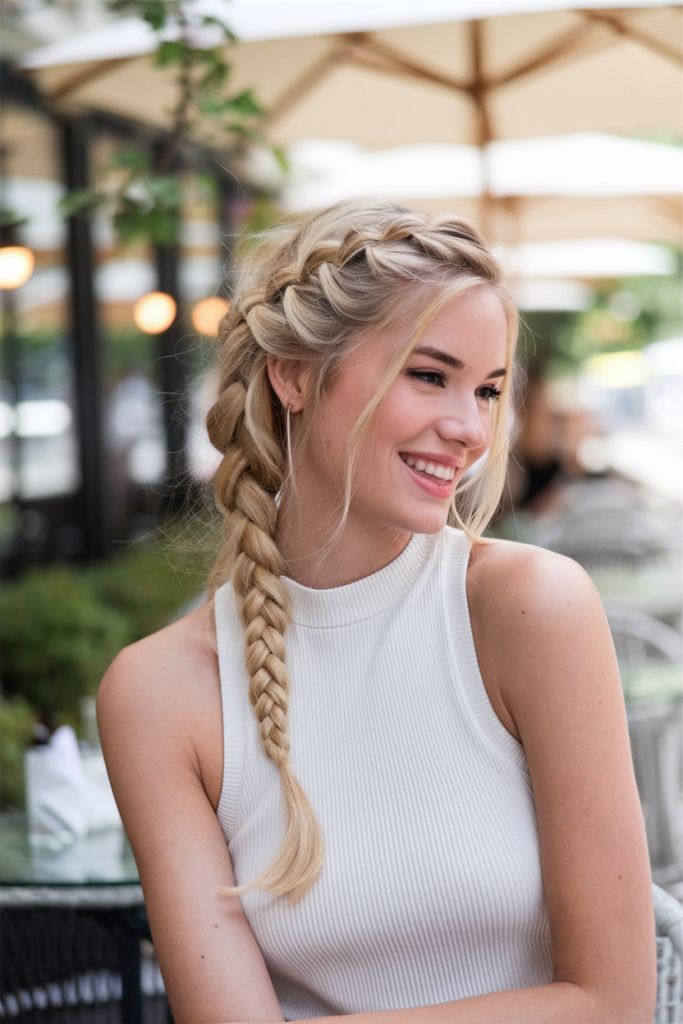 Effortless yet polished, this casual Dutch braid is all about soft textures and easy charm. The slight wave in the braid gives it an undone, lived-in vibe that’s ideal for brunches, casual dates, or cozy autumn afternoons. With a white ribbed tank top and dainty earrings, the hairstyle leans into comfort while still being intentional. This is a great option for round and heart-shaped faces, and especially flattering on highlighted or balayaged hair tones where the braid brings out natural dimension.