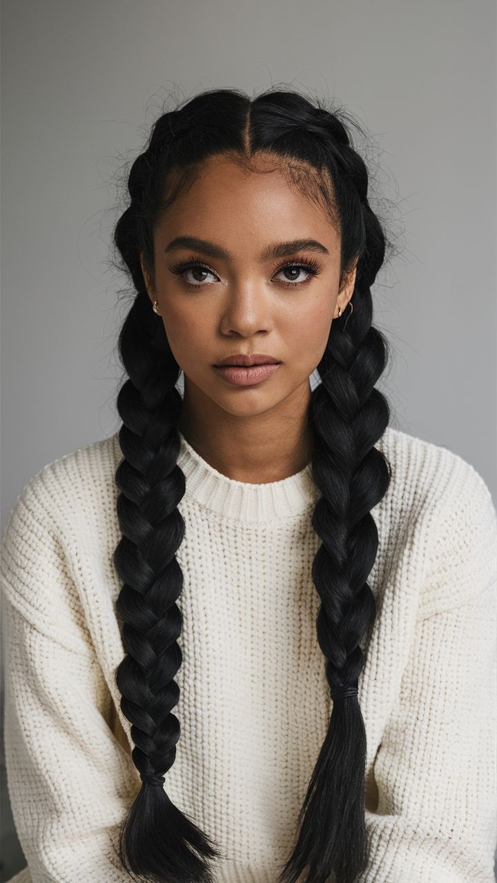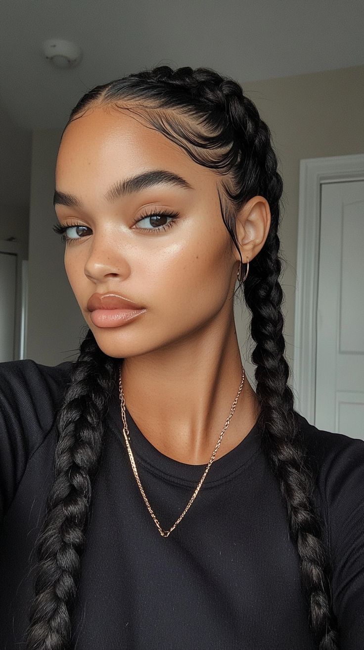 A sharp take on traditional twin braids, this hairstyle is defined by clean parting, slicked edges, and symmetrical precision. Ideal for showcasing natural beauty and facial features, this style works best on oval and heart-shaped faces. It’s an adaptable braid — perfect for gym days, casual outings, or even under a cap for errand runs.