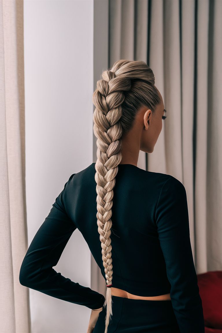 Bold, sleek, and dripping with confidence, this ultra-tight pony braid exudes futuristic power. The clean scalp contour, glassy finish, and dramatic braid thickness deliver a visual punch. The outfit, a black cutout top with sculptural shoulder details, complements the hairstyle’s assertive energy. This style is perfect for fashion events, editorial shoots, or even a commanding street-style moment. For athletic or petite figures, this look elongates the neck and accentuates strong bone structure. It’s not ideal for ultra-casual settings — this braid is meant to turn heads.