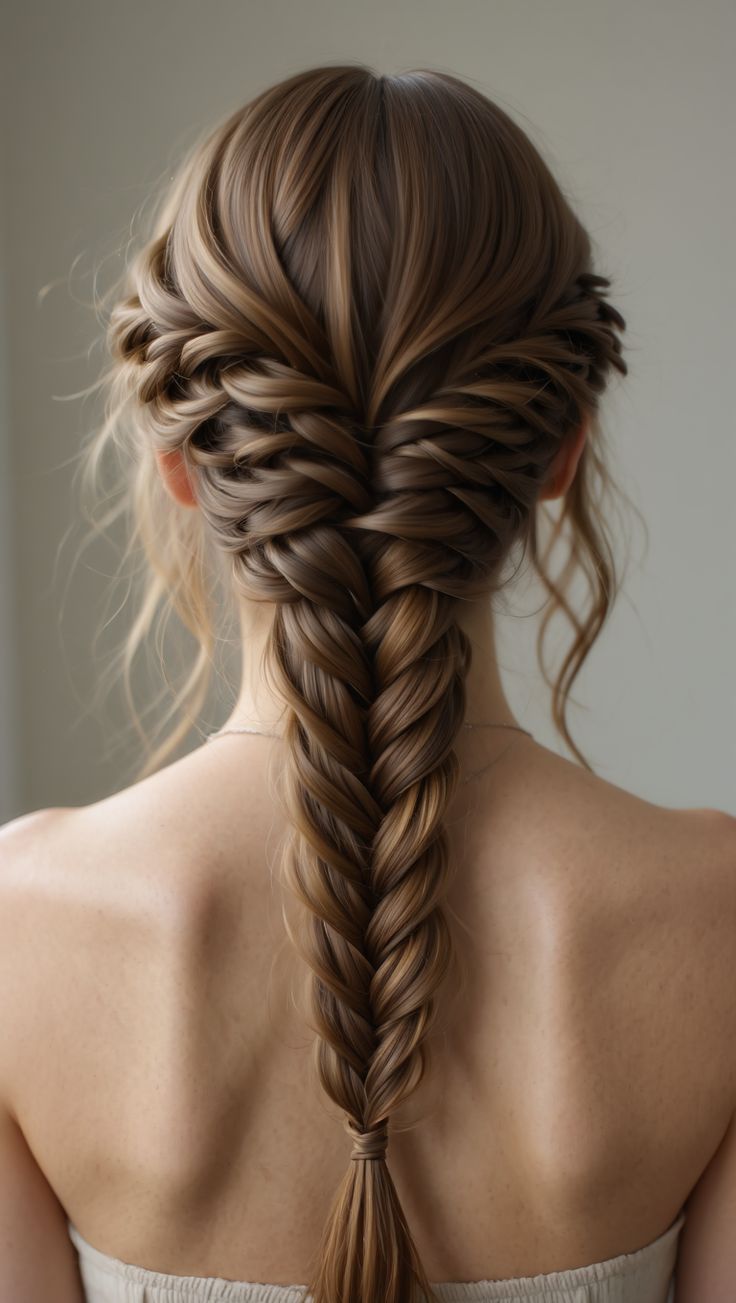 Intricate and romantic, this hairstyle is a braided fairytale come to life. The interwoven fishtail pattern creates movement and volume, making it ideal for formal fall occasions like engagement parties or barn weddings. The bare-shoulder top allows the braid to shine as the centerpiece. Best suited for longer hair lengths and oval or diamond face shapes, it’s a head-turning choice that combines softness with structure.