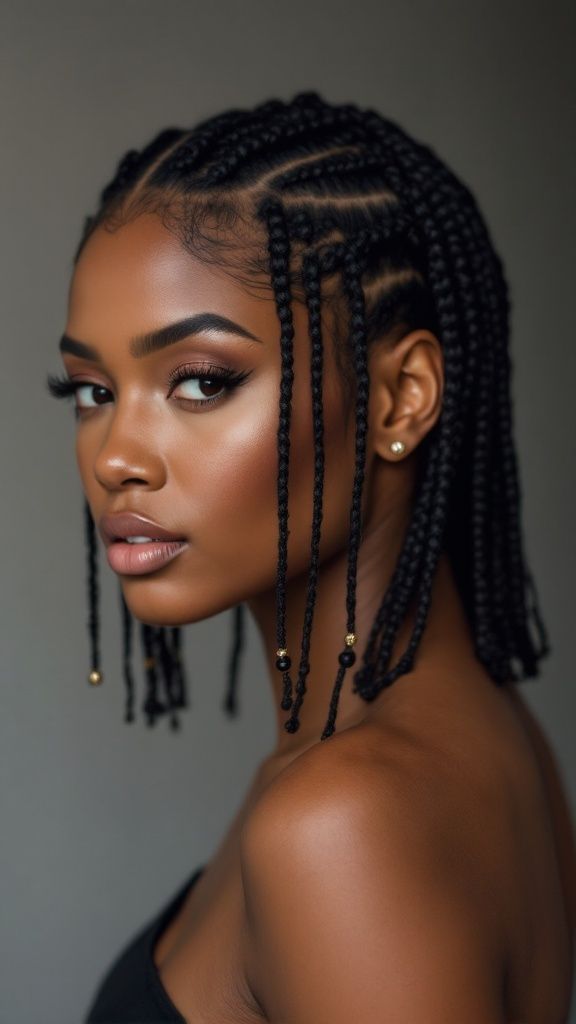 This chin-length bob of knotless box braids is modern, powerful, and protective. It’s a no-fuss style that still offers tons of visual interest, especially with the metallic bead accents that catch the light. The clean lines of the parting and the precision in braid size make this a stand-out everyday choice. It’s especially practical for busy professionals or students, and looks amazing on all face shapes.