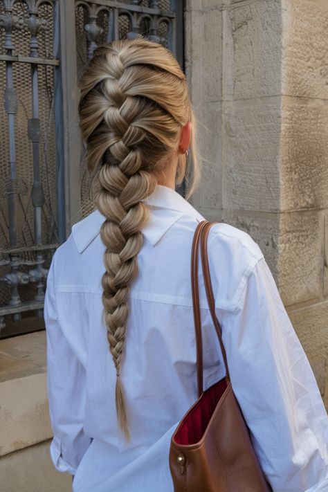 There’s something undeniably timeless about this voluminous French braid. The plait is full and well-balanced, working beautifully with thicker hair textures and cooler hair colors. The crisp white button-up shirt brings a tailored contrast that makes this style feel office-ready yet creative. It’s a perfect weekday go-to for professionals who want to keep things neat without sacrificing style.