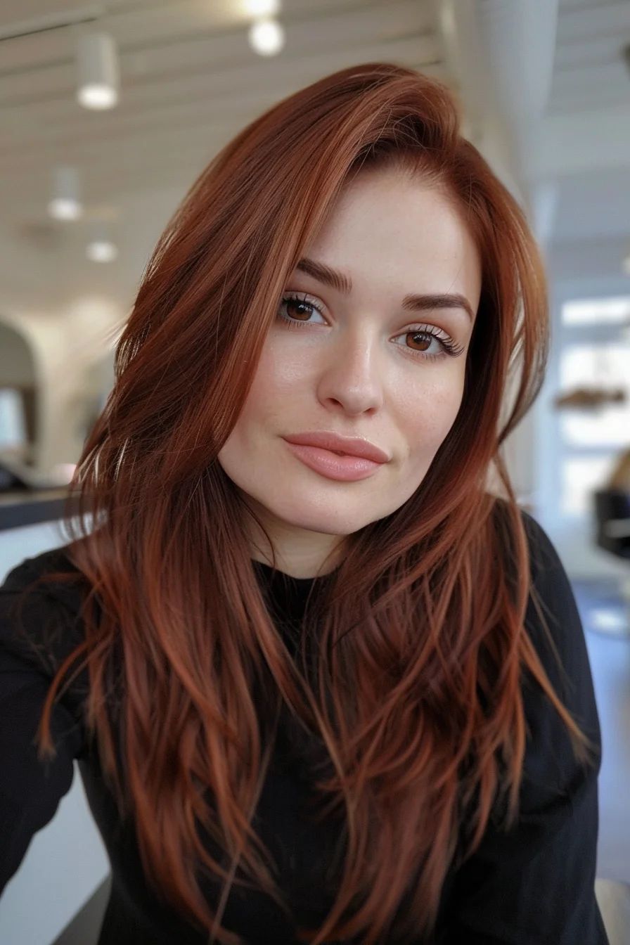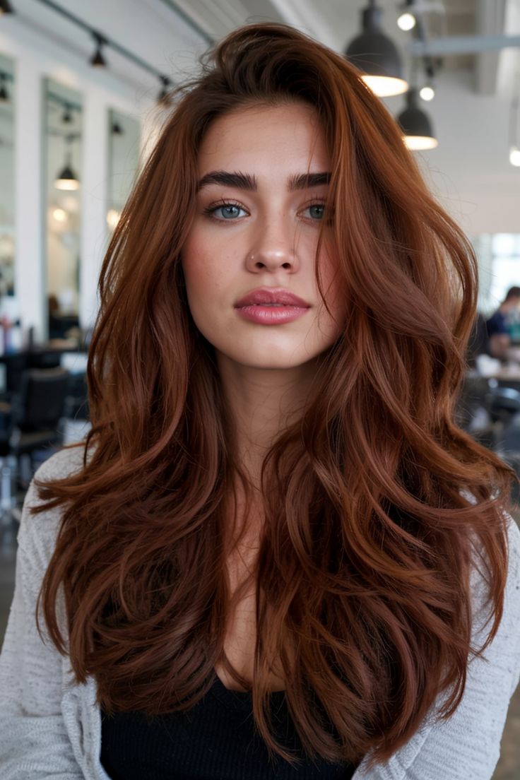 Long, soft cinnamon-brown strands cascade with feathered layers, creating effortless movement. The shade balances between rich chestnut and a whisper of copper, making it versatile across multiple skin tones. Ideal for women with mid-length to tall frames, the flowing cut elongates the body line. It works beautifully for casual outings, workdays, or even evenings where elegance meets ease, though maintaining this volume daily might be high upkeep.