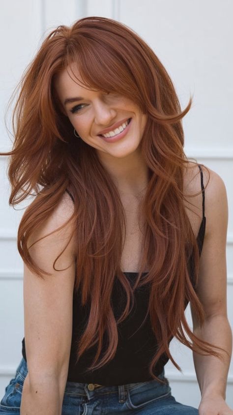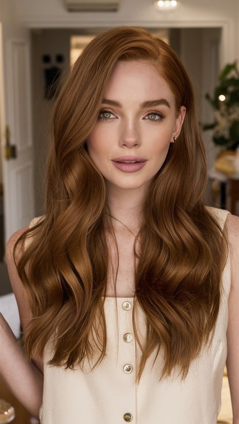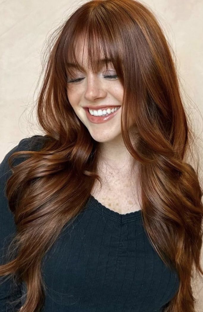 Here, long cinnamon strands with airy bangs feel youthful and playful. The tone mixes chestnut and copper, radiating warmth against light skin and freckled tones. It’s especially charming for casual weekends, concerts, or daytime outings but less suited for very formal occasions.