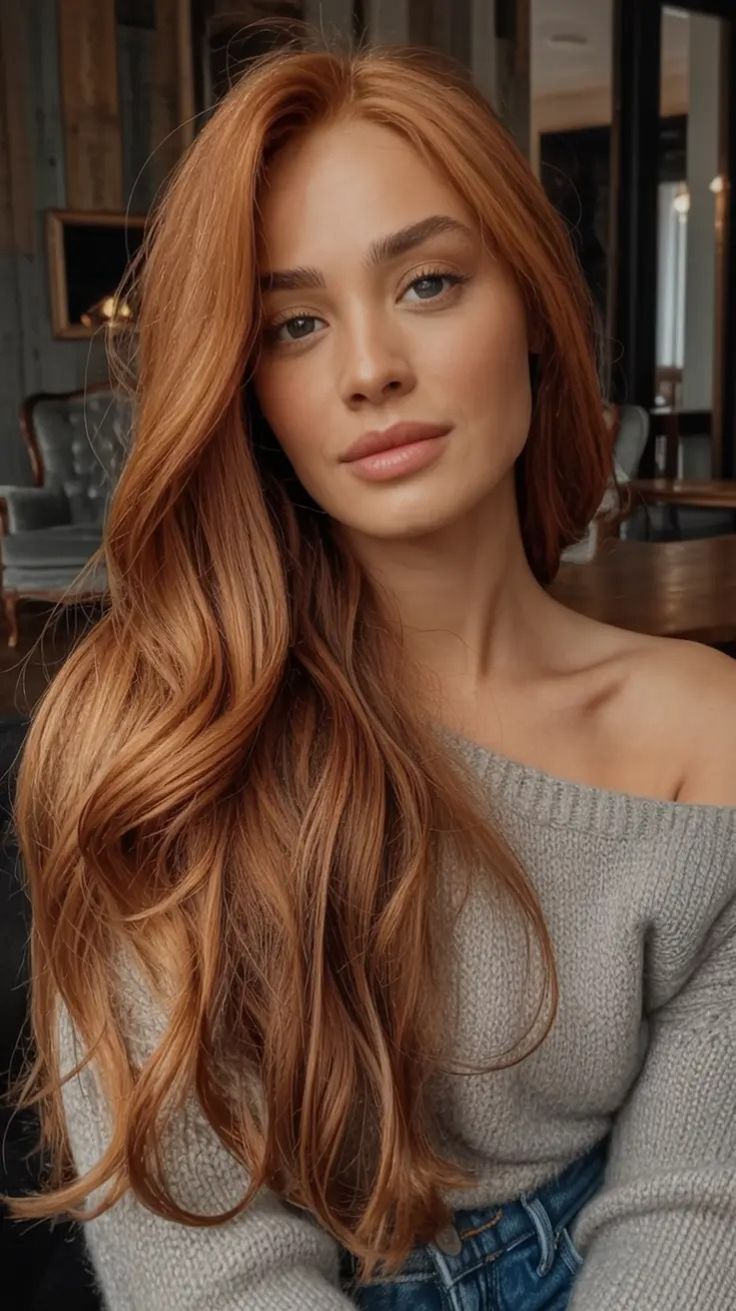 This style pairs silky, cinnamon strands with an off-shoulder knit, letting the hair become the true accessory. The hair’s light amber glow gives a honey-like sheen in natural light, sliding between caramel blonde warmth and soft sienna depth. It’s especially suitable for pale skin and olive skin tones, bringing a natural radiance to the complexion. Perfect for cozy settings or chic café dates, though less practical for high-humidity days without anti-frizz styling.