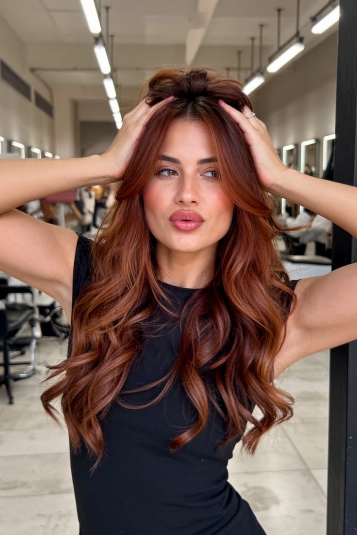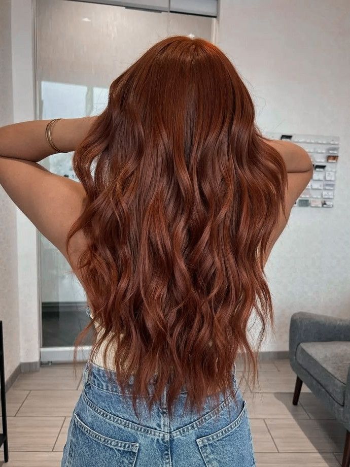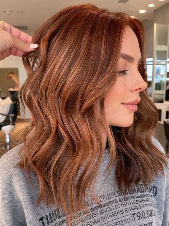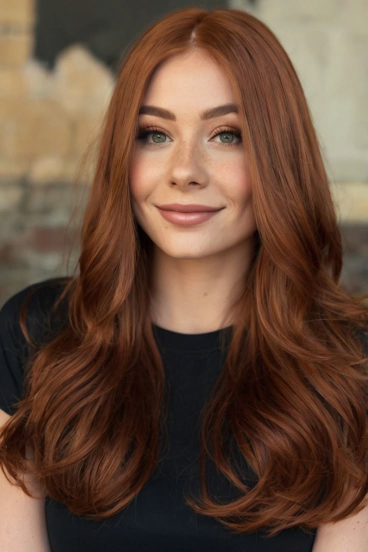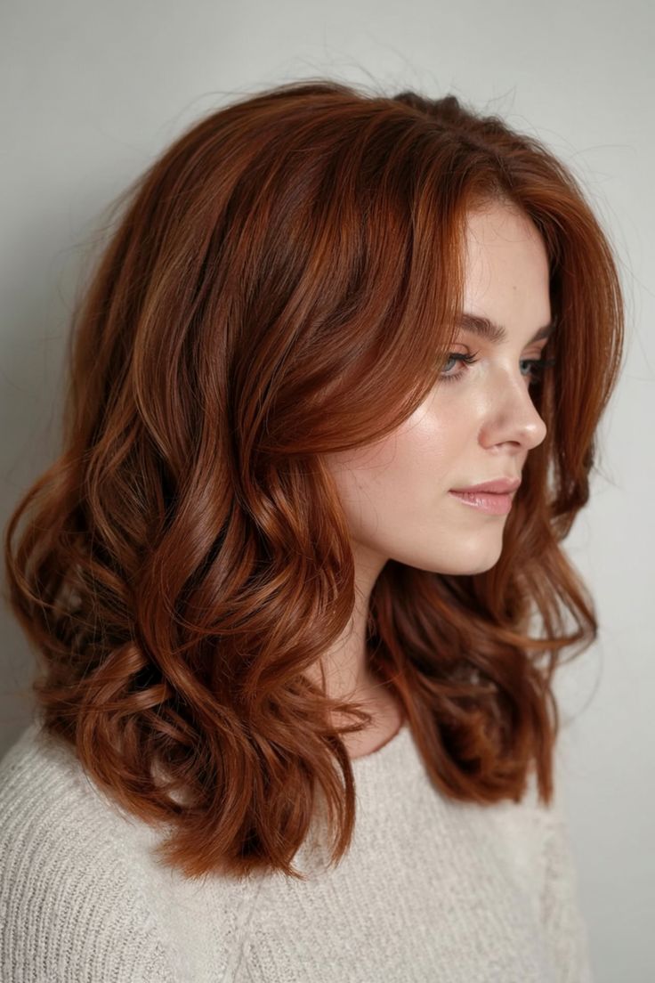 The layered waves in this look catch the light beautifully, giving off a natural soft glow that sits between sienna and copper. It’s an ideal tone for someone with olive skin or neutral undertones — the warmth enhances the complexion without washing it out. The style itself is versatile: casual enough for brunch, but polished enough for an office meeting. For petite faces, the extra volume works wonders; on very round faces, I’d suggest slightly less layering to keep proportions balanced.