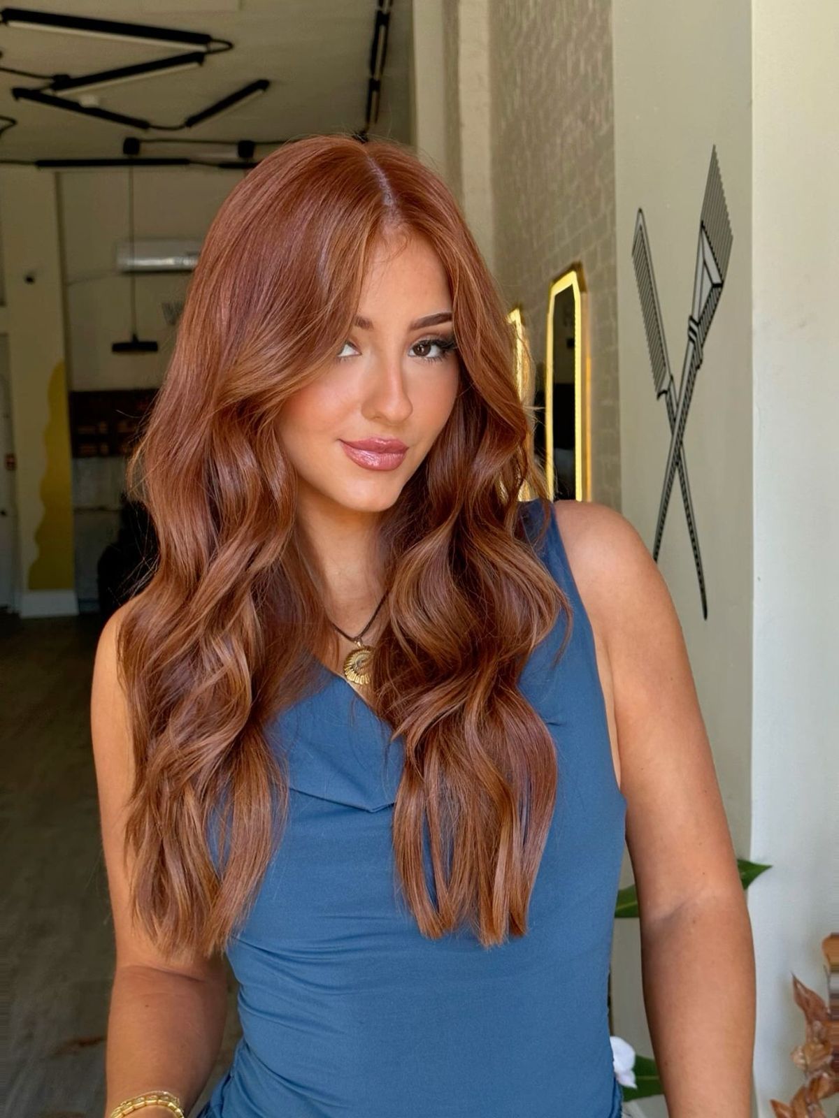 This look plays on contrast: cinnamon waves paired with a blue dress. The tone glows with a copper and caramel blonde undercurrent, perfectly offsetting the cool shade of the outfit. It flatters tan skin and light skin equally, especially in transitional seasons. Less practical for very formal events, but perfect for date nights or creative work settings.