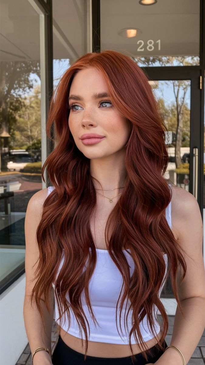 This shade is where cinnamon meets bold red. It’s fiery, vibrant, and incredibly flattering on tan skin and dark skin alike. It shines brightest outdoors, where the undertones reflect beautifully in natural light. This style feels best for adventurous personalities who like their hair to make a statement.