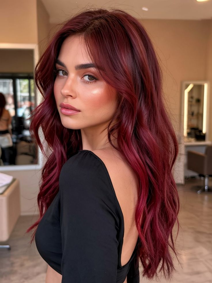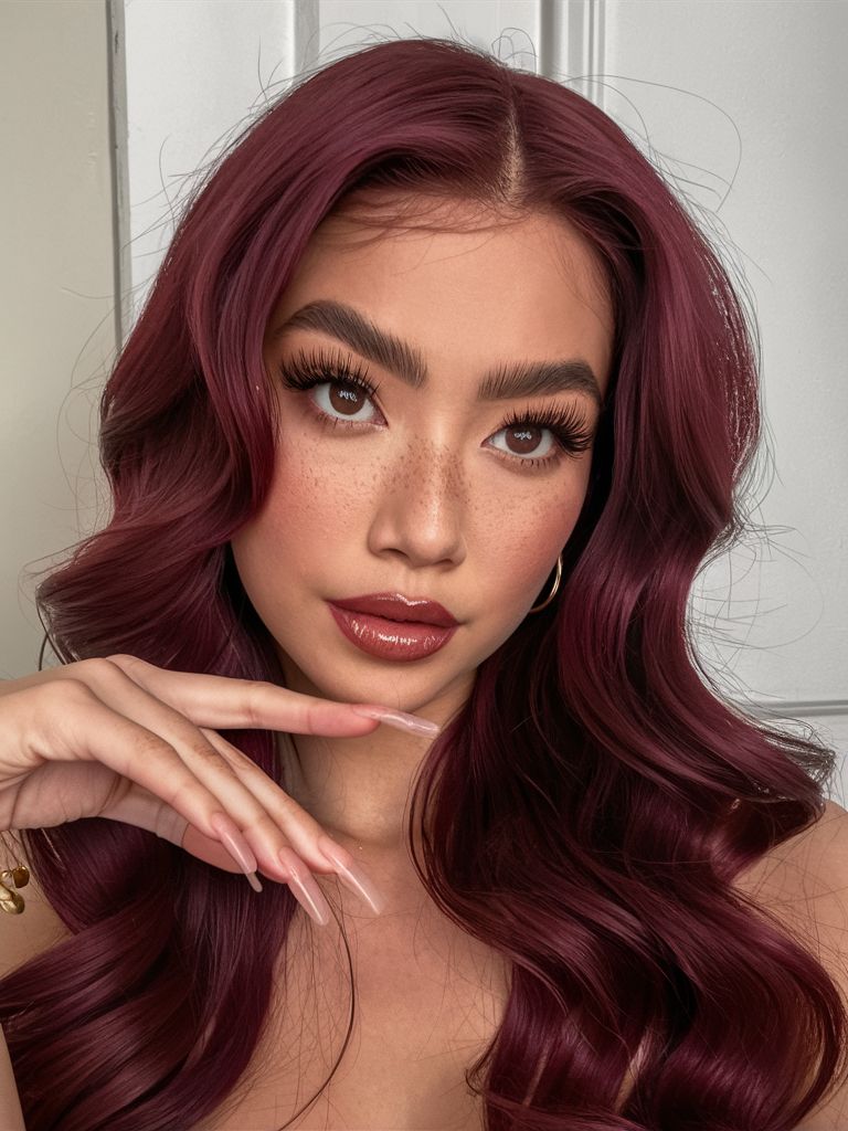 The deep cherry shade here blends beautifully into a glossy, almost satin-like wine tone—rich, dimensional, and quietly dramatic. The long cascading waves soften the face and build that subtle, luxurious volume that works particularly well for oval and heart-shaped faces. Because the tone leans deeper into the dark palette, it flatters warm and neutral skin tones without overwhelming them. The strapless burgundy-toned top keeps the entire look cohesive and elegant, making it perfect for date nights, events, or anywhere you want polished glamour without fuss.