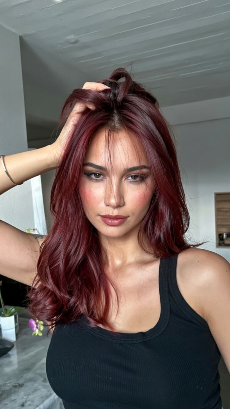 This final cherry look is pure luxury: deep, velvety, almost black-cherry undertones with plush waves that catch light like satin. It’s ideal for those who prefer a dark and sensual palette rather than a bright pop of red. The middle part gives precise symmetry, while the robe adds a getting-ready elegance that feels polished yet relaxed. This shade works beautifully with brown, dark skin, and cool undertones. It may not be ideal for extremely warm undertones unless paired with the right makeup.