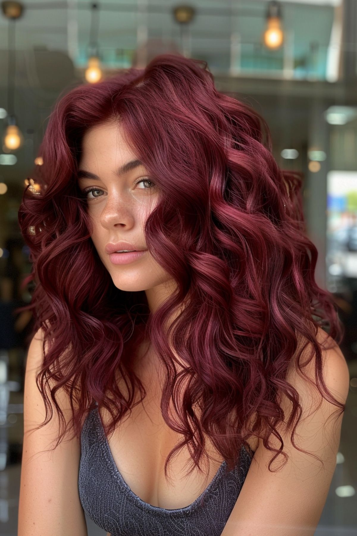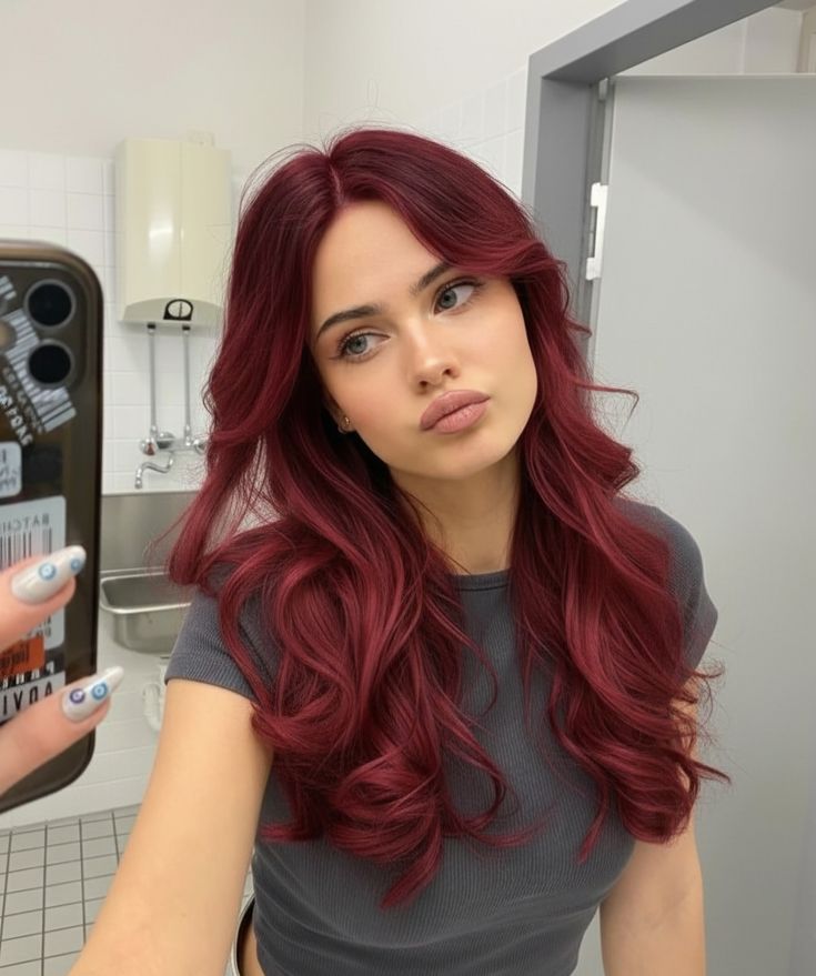 This is an elegant take on cherry hair, leaning toward a deep wine tone rather than bright cherry. The center part ensures symmetry, while the loose curls soften the jawline and add a luxe feel that’s fabulous for formal events or dressed-up evenings. This look works especially well for medium to long hair lengths and complements both cool and warm undertones thanks to its balanced saturation. It’s not ideal for those with extremely short layers, as the curls lose definition.