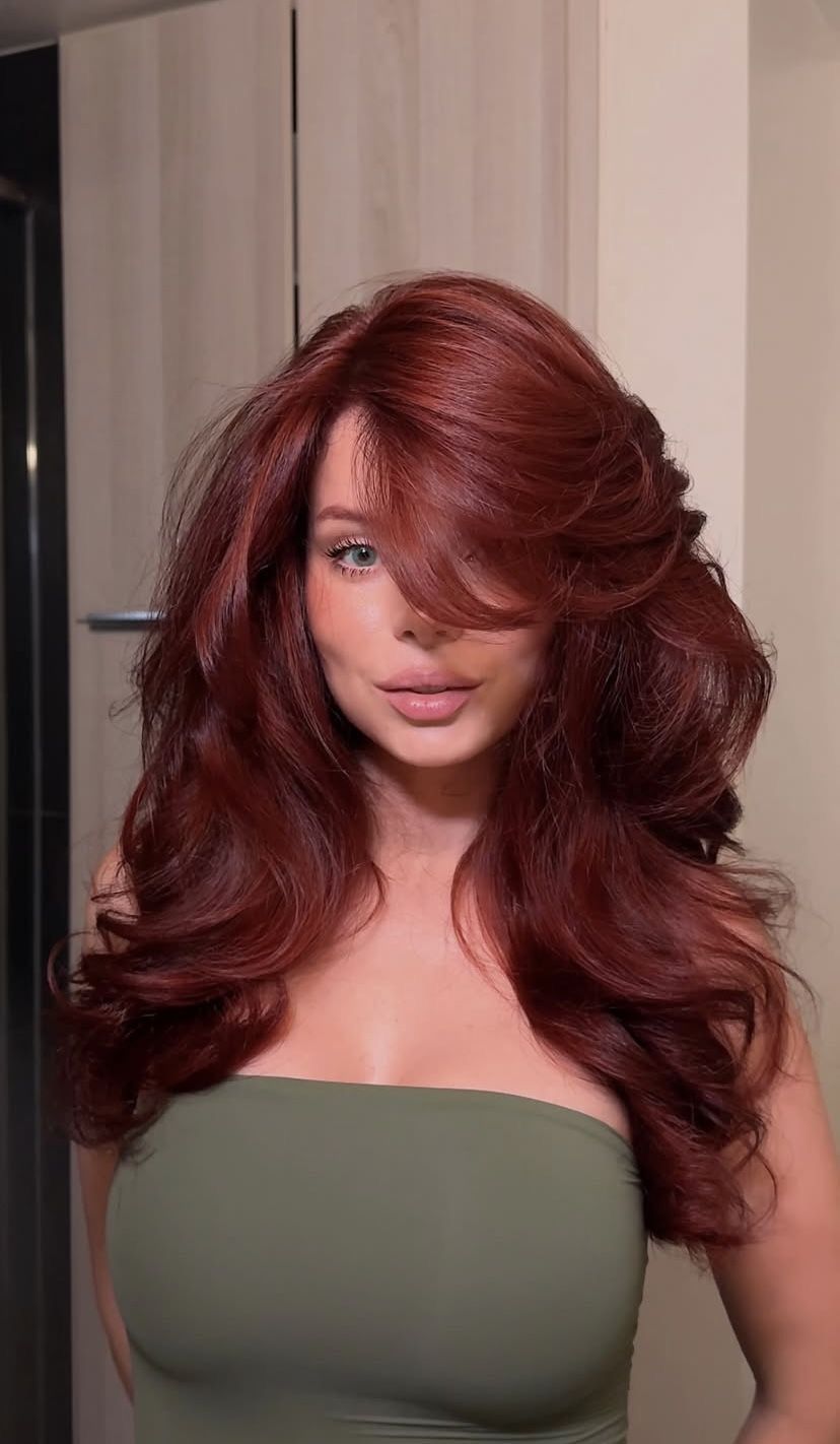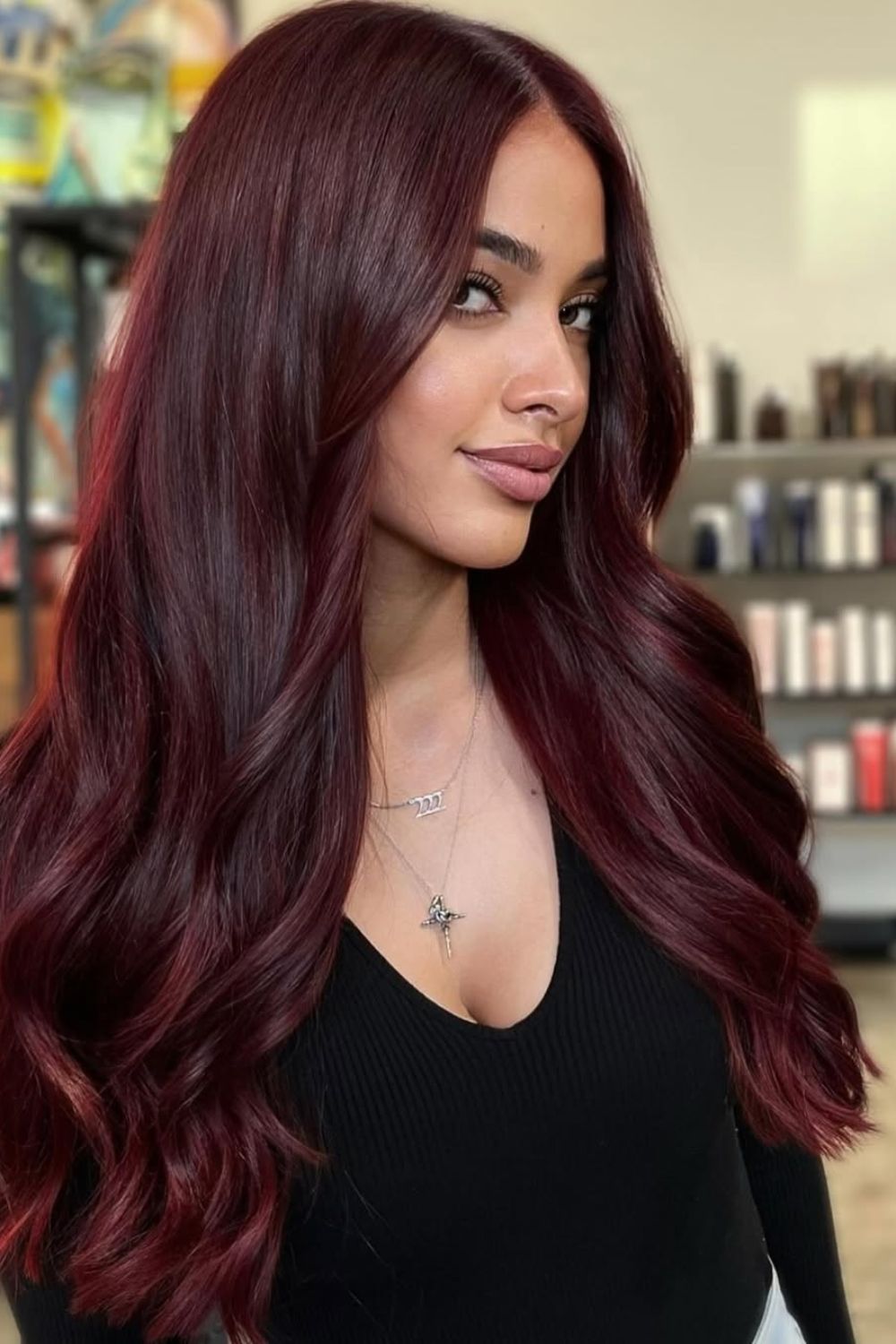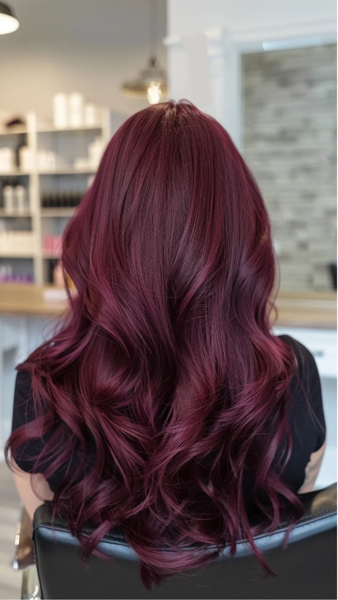 This look blends deep cherry pigment with soft, glowy waves—the kind of style that feels effortless but polished enough for everything from weekend brunch to a night out. The tone sits somewhere between chocolate and burgundy, creating a multidimensional finish that flatters medium and cool undertones beautifully. It’s a particularly gorgeous option for those with balanced features or oval face shapes, since the curtain-soft volume shapes the face without overwhelming it. This shade isn’t ideal for very oily scalps, though, since high-shine reds can emphasize root oil more quickly.