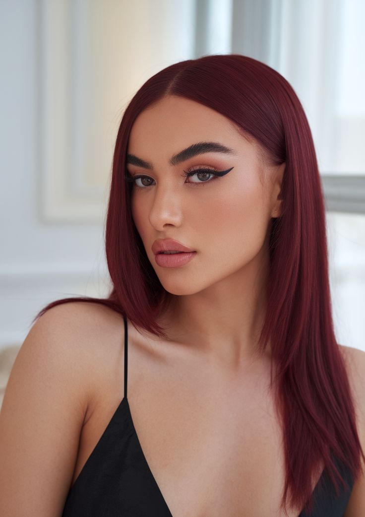 This is the refined, minimalist side of cherry red: straight, sleek, and richly pigmented. The hair flows like velvet, creating a smooth sheet of color that flatters oval and heart-shaped faces. The deep tone sits in the dark spectrum, making it sophisticated and ideal for evening events, business settings, or polished daywear. Pearl earrings introduce a gentle, luxe element without overpowering the minimalist styling.