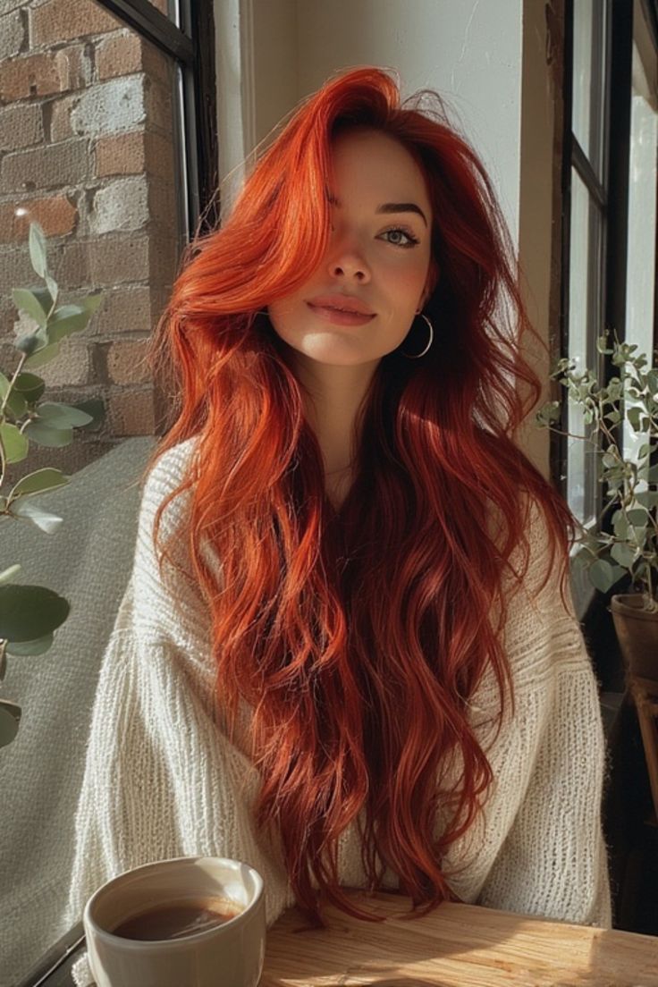 This look blends fiery cherry with bright copper—a glowing, sunlit interpretation of the trend. It’s incredibly flattering on tan skin, Indian skin, and warm undertones because it lifts the face like natural warmth. The long, loose waves enhance fullness and feel casual yet polished, while the oversized knit softens the whole aesthetic, giving effortless morning-coffee energy. This is a practical choice for those with curly hair who straighten or style loosely—the waves hold texture beautifully and don’t need perfect precision.