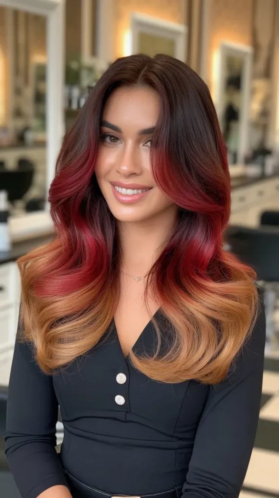 This color story is all about layered combinations—deep burgundy at the roots melting into cherry red mids and finishing with honey-chocolate ends. It’s bold yet wearable, especially flattering for brown skin or tan skin, as the warm gradient enhances natural undertones. The fitted black top lets the color remain the star while keeping the silhouette sleek. It’s an excellent choice for anyone who wants color that feels playful but still grown-up.