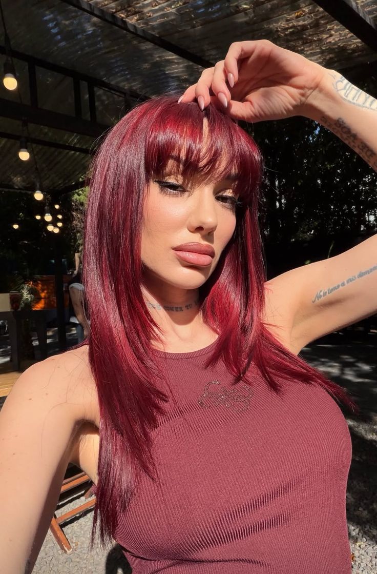 This version of cherry red catches sunlight with a fiery vibrance, showing off highlights dark brown undertones that glow outdoors. The layered cut with full, textured bangs brings movement and an easy-going attitude that works beautifully for warm-weather outings, café stops, and off-duty days. It’s a great pick for oval and strong jawlines because the bangs soften edges without losing structure. Not ideal for those who prefer extremely low-maintenance hair, since bright reds fade more quickly in UV exposure.