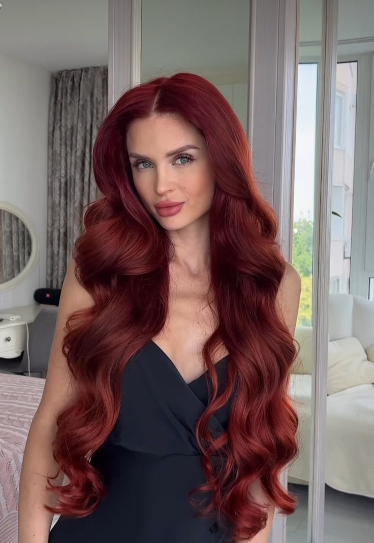 Here, cherry red takes a dramatic turn—long, sculpted curls cascading with a soft gradient from cherry to burgundy. This is ideal for someone who embraces maximalism and doesn’t shy away from a head-turning aesthetic. The length and density make it perfect for tall frames or for balancing strong facial features. It’s a beautiful option for evening events, photoshoots, or special celebrations. Not ideal for very fine or fragile hair unless extensions are used.