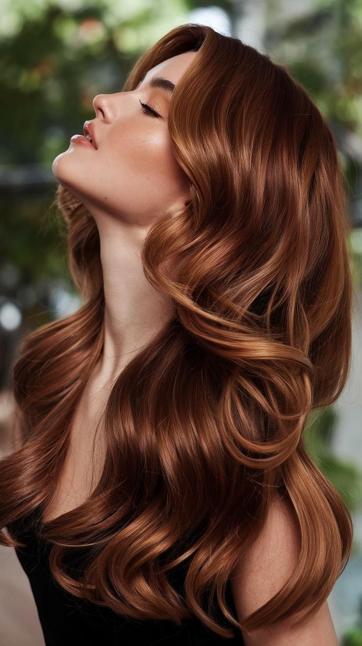 This is a vintage-kissed chestnut—voluminous, lush, and reminiscent of old-Hollywood blowouts. The waves are sculpted, uniform, and glossy. The color is stable and rich, with a soft honey warmth catching certain angles. This look is extremely event-ready: weddings, galas, photoshoots, or formal dinners. Works beautifully on symmetrical face shapes or anyone wanting a glamorous lift.