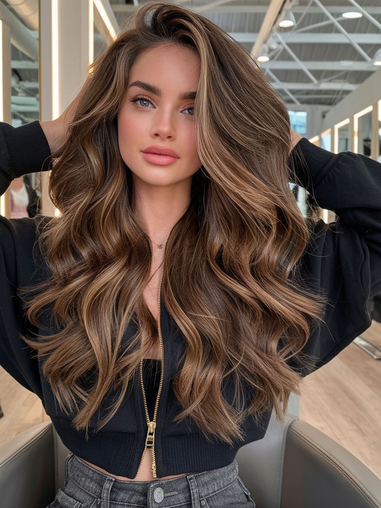 Big, brushed-out volume. Barrel-wave movement. The kind of hair that feels like you just stepped out of a blow bar. The caramel highlights are subtle—woven delicately rather than stacked—which lets the length stay unified. Best for denim, bomber jackets, or elevated casual wear.
