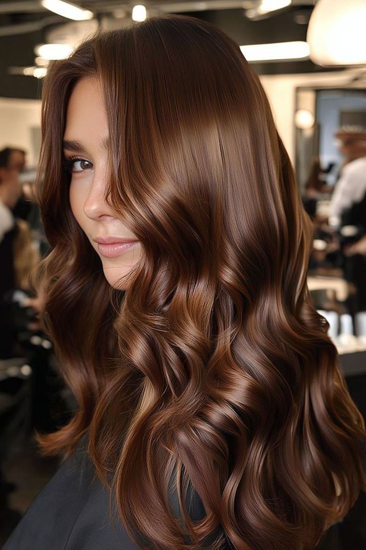 This variant pulls slightly deeper—think chocolate velvet with subtle top-coat luminosity. The finish is plush, textured, and distinctly modern. A great option for thicker hair types or piecey layers. Best for someone who loves glamorous volume but doesn’t want to step into heavy red territory.