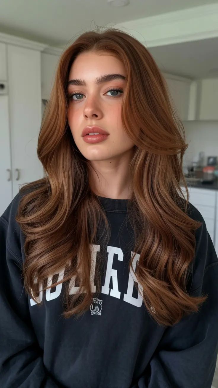 Chestnut with a hint of honeyed copper—this leans warmer, perfect for someone wanting a sun-touched glow without going red. The styling brings movement, with soft bends that feel romantic and feminine. Ideal for spring/summer wardrobes or minimalist neutrals. This version would flatter lighter eyes or warm undertones especially well.